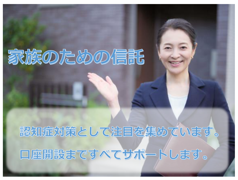 しかし、判断能力がある時に、事前に信頼できる家族に財産の管理承継や処分を託すことで、ご本人様や認知症や脳梗塞などで有効な意思表示ができなくなっても、託された家族(受託者)の権限のみで、法律上有効に、事前に定められ権限内で不動産や預金などの管理・処分ができます。