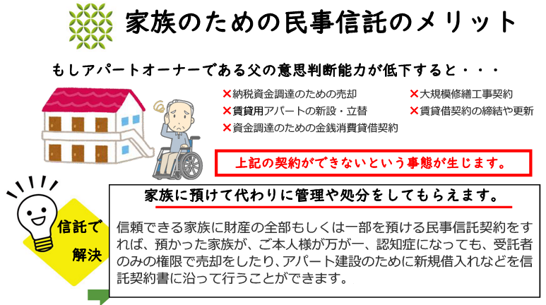 特にアパートオーナーである方の資産管理の問題で認知症等になり、法定後見人が選任された場合、不都合なことが多いです。